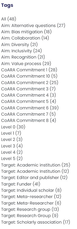 The idea catalogue platform has been built to make it as simple as possible to find ideas for experiments in research assessment that can be tested and/or implemented in your setting and context. We have created categories that allow for filtering around different target groups, challenges in assessment reform, or CoARA commitment, showing all of the potential experiments that could fit in each category.